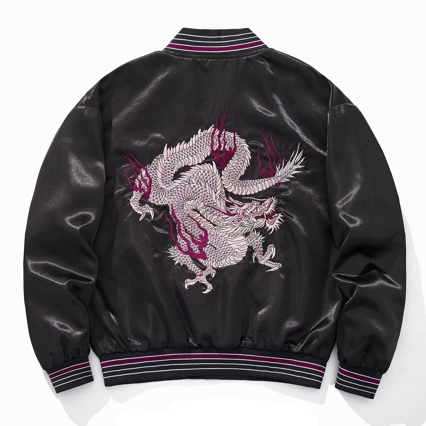 The Ryugetsu Sukajan (龍月, “Dragon Moon”) embodies quiet power and mystique — a tribute to the balance between ferocity and grace. Its embroidered silver dragon coils across a deep obsidian satin canvas, accented with streaks of violet flame symbolizing transformation and inner strength. Inspired by the dual forces of chaos and calm that shape every journey, this piece bridges tradition and rebellion in a single sweep of thread.