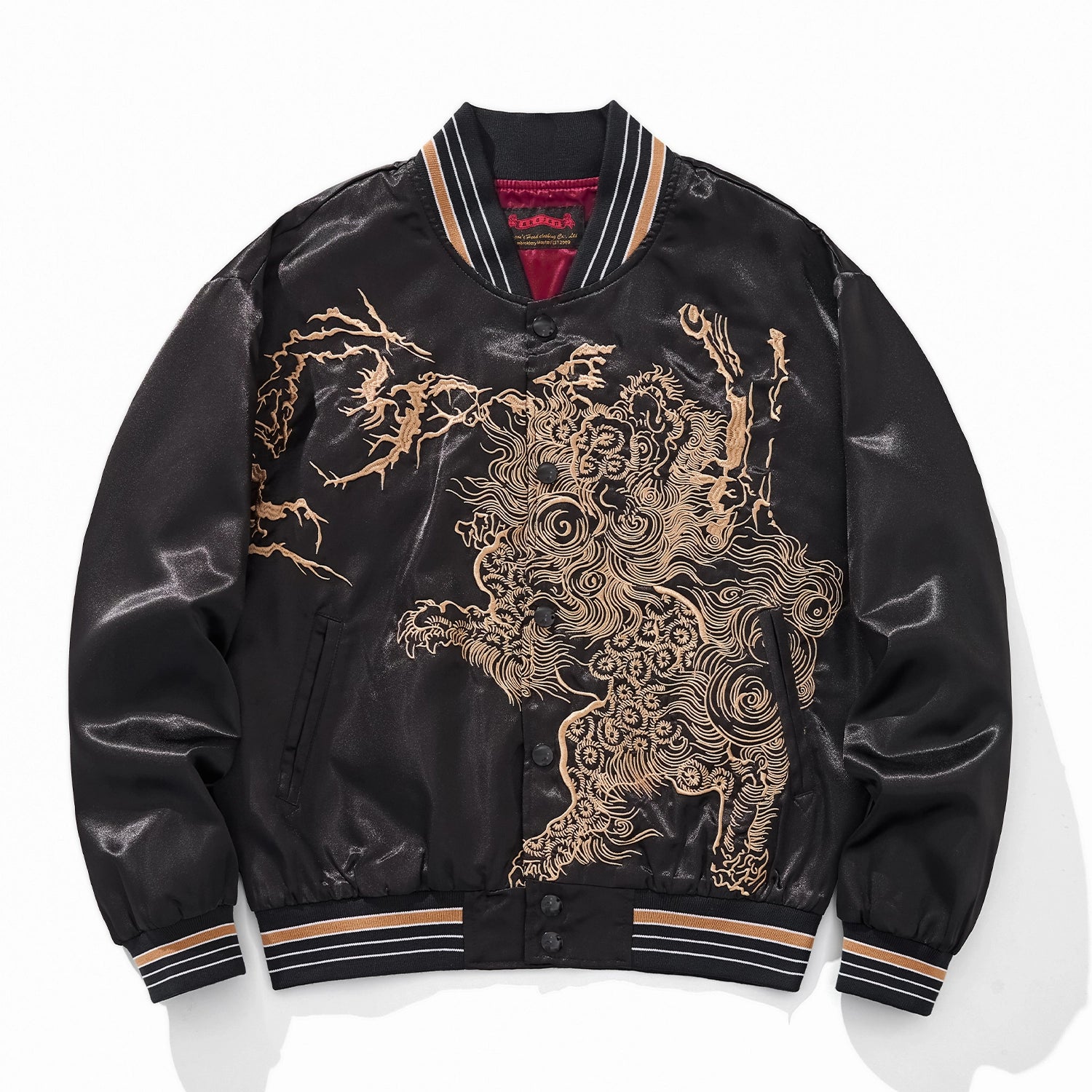 The Shishi Sukajan pays homage to the guardian lion-dog — a mythical creature said to protect temples and ward off evil spirits. Its fiery mane and poised stance represent courage, loyalty, and protection. Set against a backdrop of chrysanthemum blooms and golden vines, the design blends fierce energy with regal poise, embodying the duality of strength and serenity found in traditional Japanese symbolism.